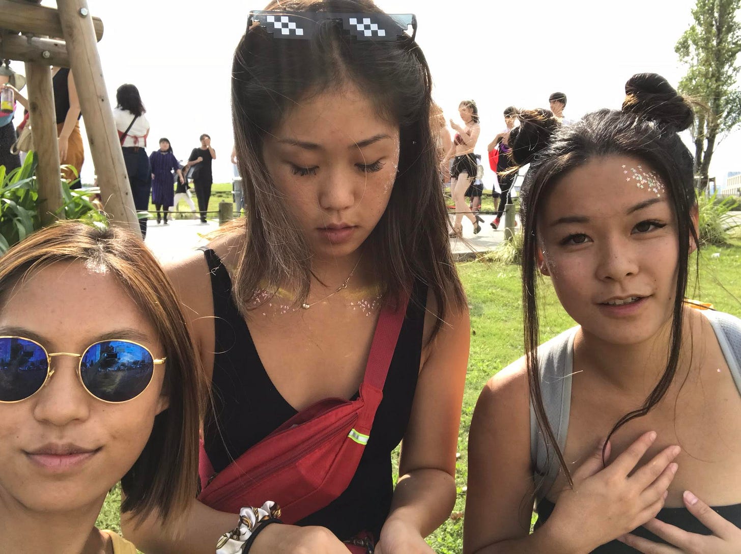 But there's something else — see, the people staggering by us are blasted out of their minds. Not unusual at a festival by any means, but… the type of staggering. That’s what gets me. Most festivals are jammed to the brim with folks drifting by, sky high from pill concoctions stuffed inside pastel fanny-packs. But here, everyone is blindingly, smashingly drunk. Neck after neck is yoked with plastic shot glass lanyards. A guy next to us pulls out a (glass!) handle of vodka from his crotch and offers it to us, grinning.